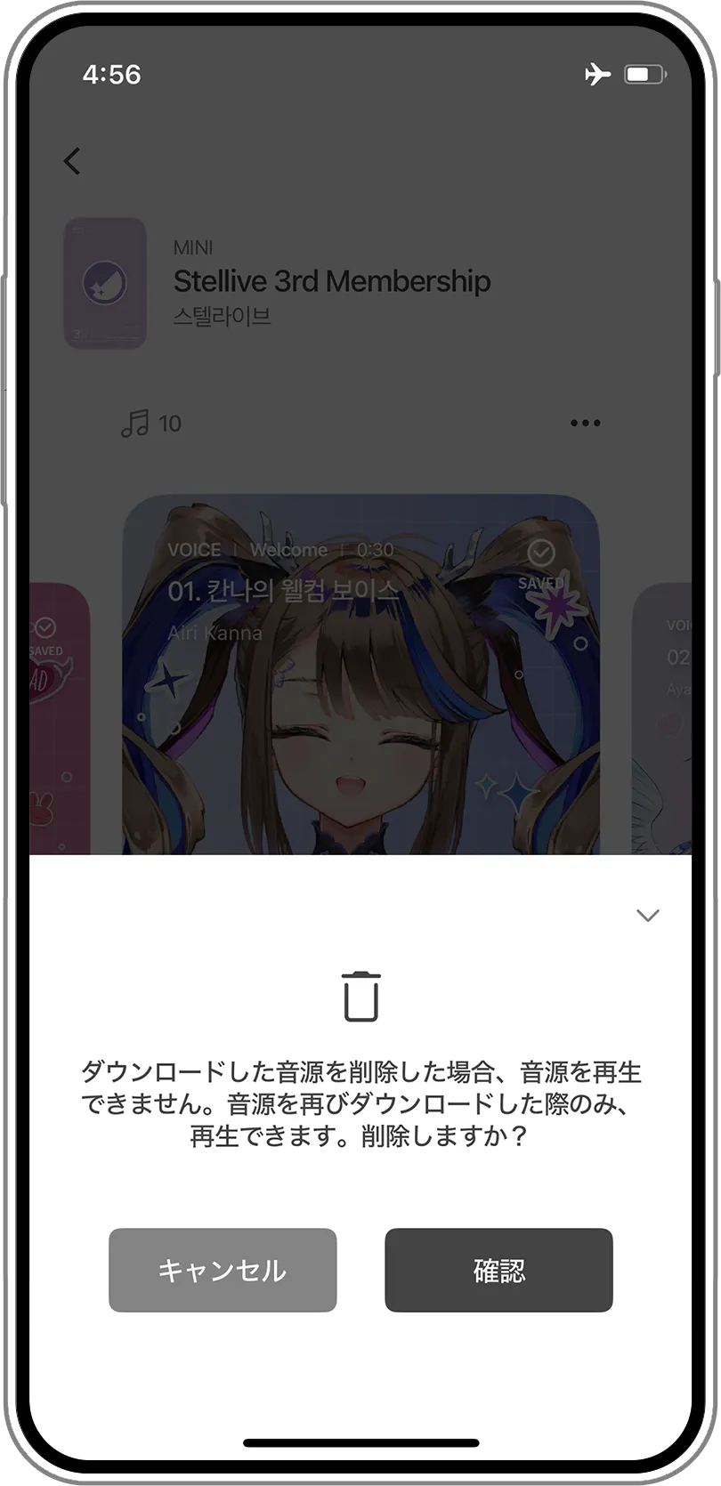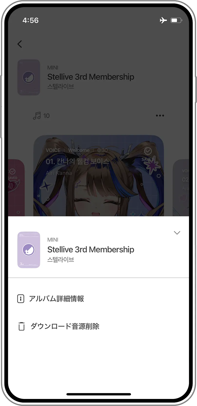 もしすでに登録されたアルバムに”SAVED”ボタンが表示されていない場合は、アルバム内で詳細ボタンを押し”ダウンロード音楽削除”ボタンを押したのち、再びダウンロードしていただくと、正常に利用いただけます。