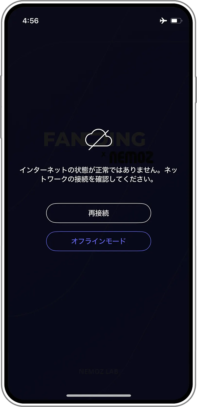 機内モードやモバイル通信を切ったあと、再び FANDING x NEMOZアプリを始動してください。